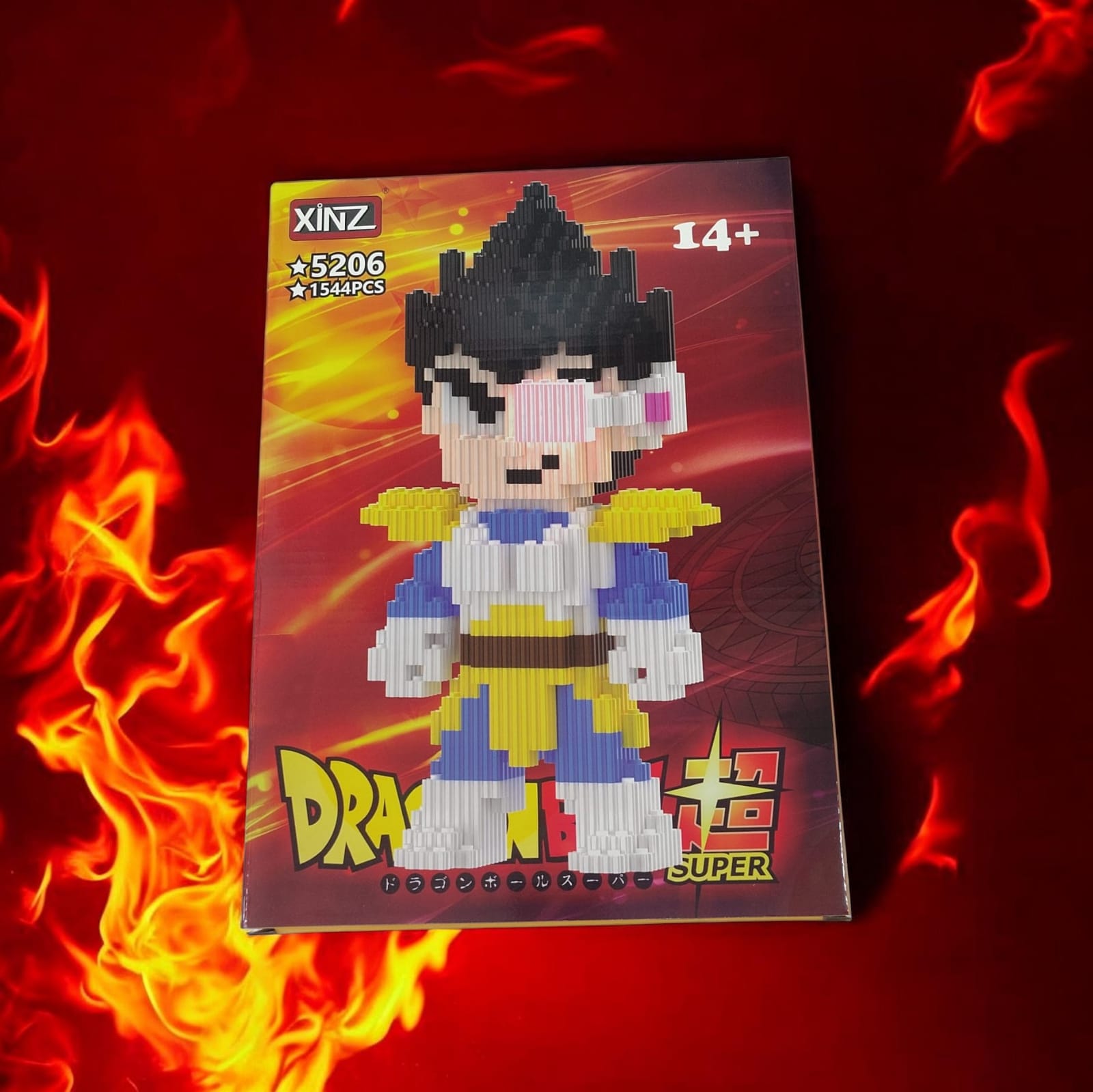 Increíble figura armada en bloques tipo LEGO inspirada en Vegeta en su poderosa transformación Super Saiyajin. Cabello dorado, traje de batalla azul y detalles que resaltan su estilo guerrero.