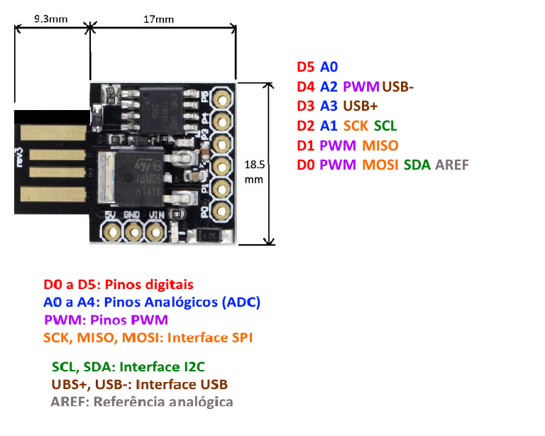 • 6 pines I/O, 2 de los cuales se usan en la carga de los sketches pero quedan libres después de la