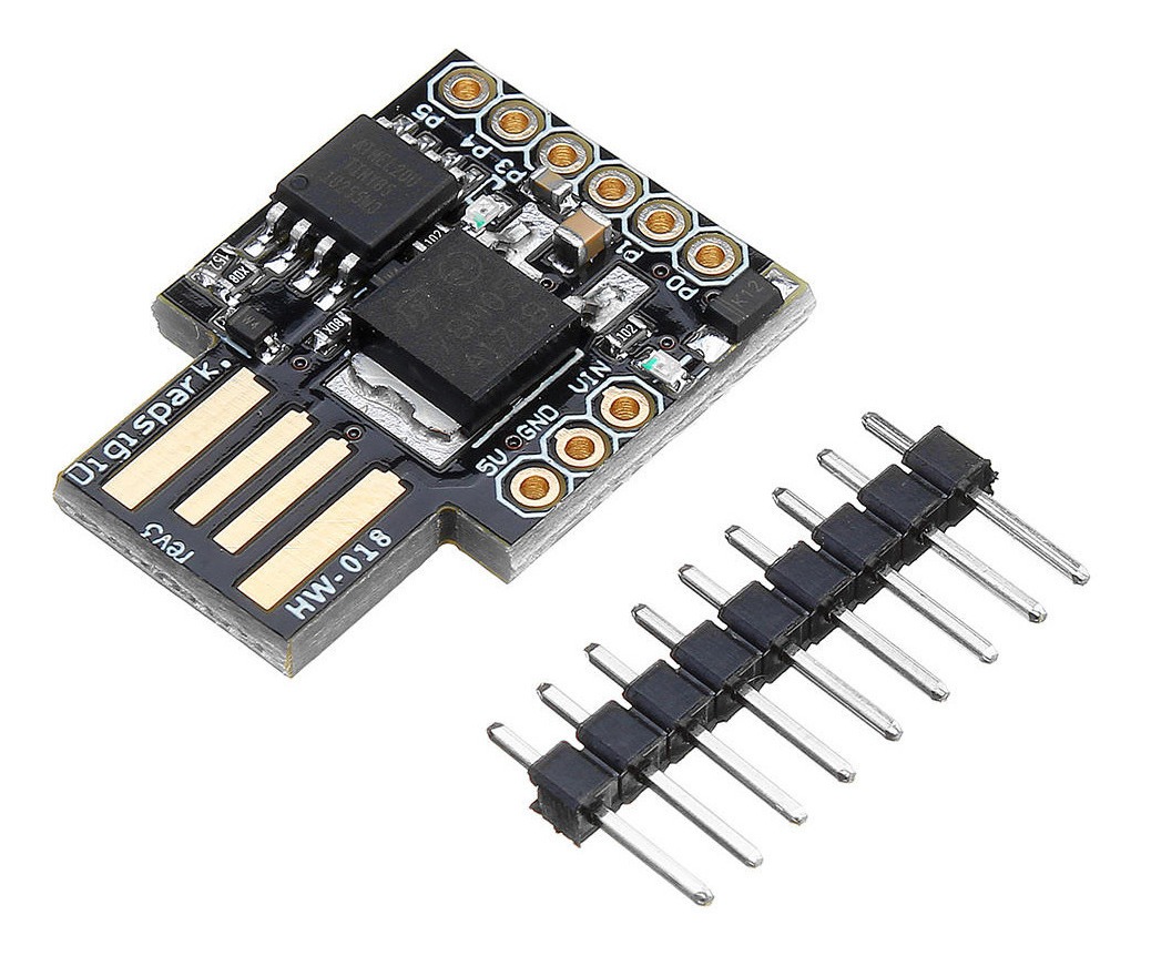 Es una tarjeta de desarrollo basada en el microcontrolador ATtiny85, similar a las tarjetas de la línea Arduino, pero más económico y pequeño y lo mejor es que no requiere de cable USB para su programación ya que se puede conectar directamente en el puerto USB de cualquier host, sea este un PC, laptop, etc. Funciona con el IDE de Arduino y es perfecto para utilizar en proyectos en donde se requiere manejar un número reducido de pines I/O y/o otra tarjeta Arduino es demasiado grande para cumplir el propósito, pues Digispark tiene 6 pines I/O multipropósito.