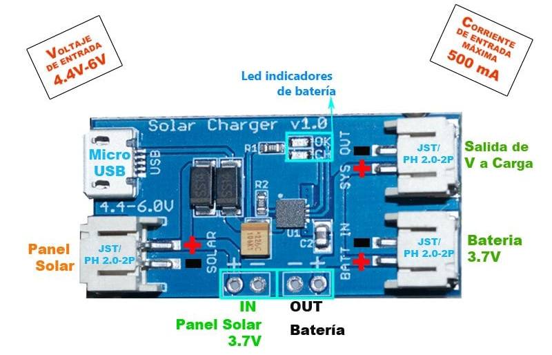 La salida del cargador solar está destinada a cargar una sola celda de iones de litio de polímero. La carga debe conectarse en paralelo con la batería.