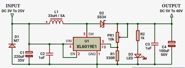 El XL6019 es un regulador DC-DC elevador (boost converter) diseñado para aumentar un voltaje de entrada más bajo a un voltaje de salida más alto. Este módulo es popular por su alta capacidad de corriente y eficiencia, lo que lo hace ideal para proyectos que requieren suministrar energía a dispositivos con mayores demandas de voltaje.