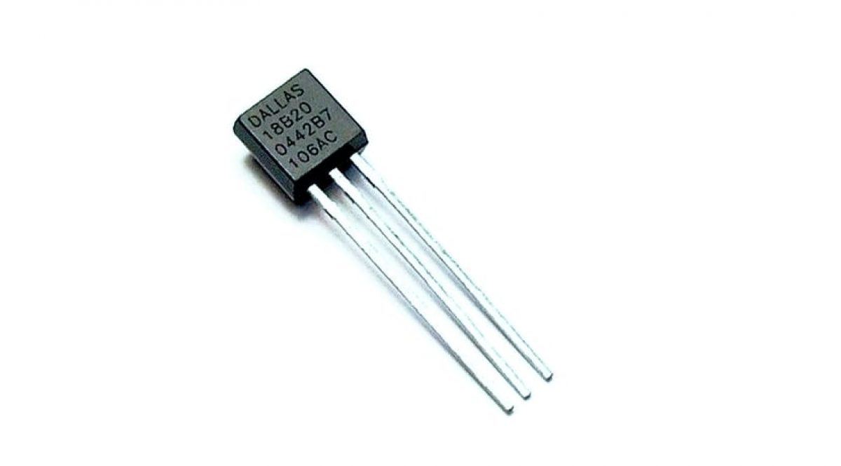 El sensor DS18B20 es usado para medir temperatura ambiente. Soporta lecturas multipunto, tiene incorporado una resistencia pull-up. El rango de temperatura es de -55 °C a 125 °C. Posee tres pines, distribuidos de la siguiente manera: 1. GND(-), 2. DQ(Señal de salida) y 3. Vcc(+).