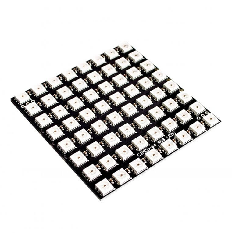 La matriz de leds ultra brillantes RGB direccionales integran el controlador WS2812 lo que permite ajustar cada led dentro de una cadena de comandos desde una placa de Arduino, AVR, PIC o MBED. Este módulo es conectado en cascada donde se puede controlar varios módulos simultáneamente. Cada pixel puede alcanzar 256 niveles de pantalla de brillo a una frecuencia de escaneo a 400 Hz a un consumo de 18 mA de corriente constante por cada led.