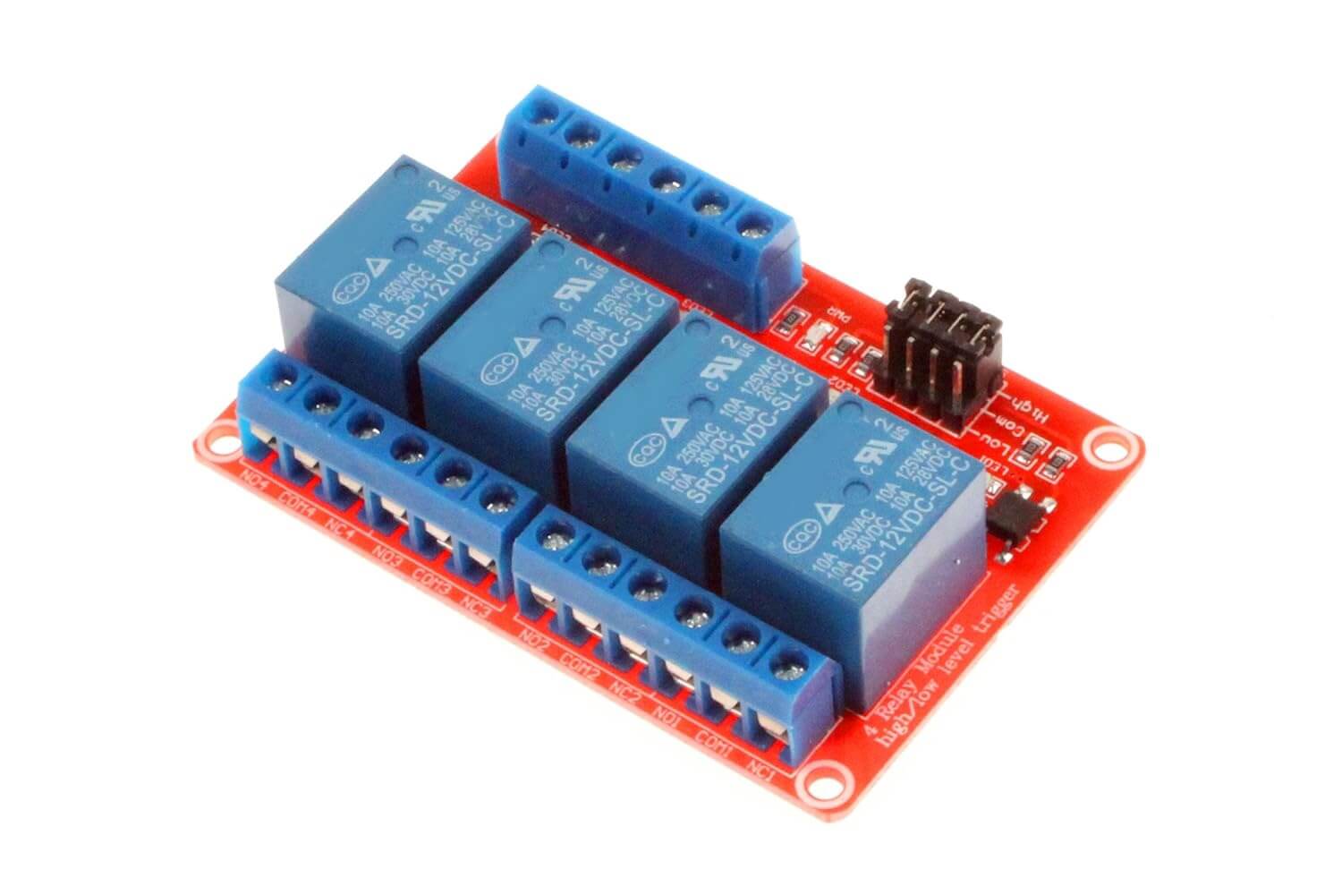 • NC1, NC2, NC3, NC4: Terminales normalmente cerrados de cada relé, se desconectan cuando el relé se activa.