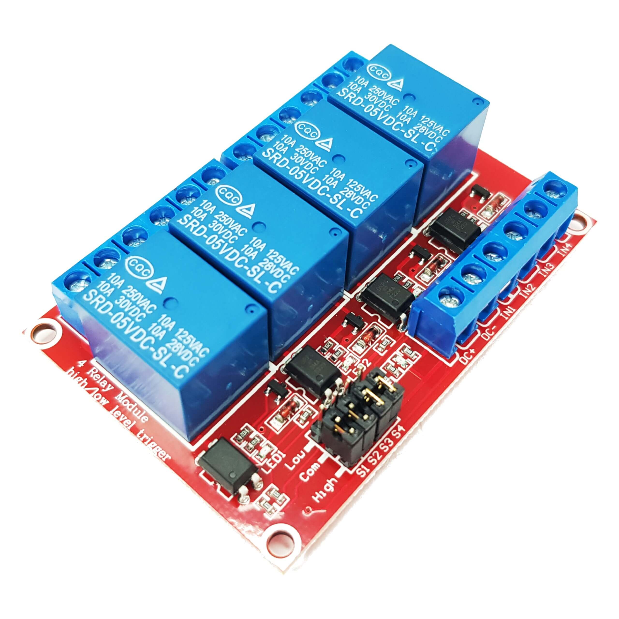• El módulo se activa mediante una señal de 5V DC. Cada canal tiene un pin de entrada (generalmente etiquetado como IN1, IN2, IN3, IN4) que se conecta a un pin digital de un microcontrolador o una fuente de señal.