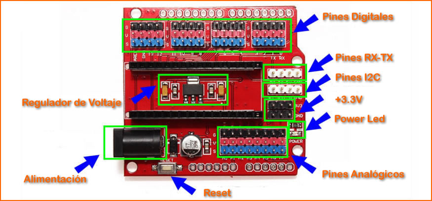 • Shield de Expansión para Arduino Nano (compatible con Arduino UNO o similares)