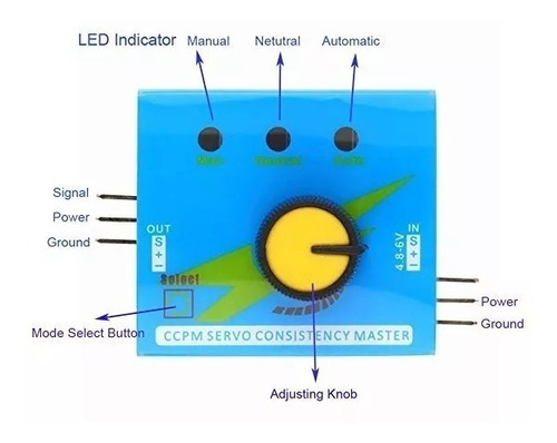 La capacidad de detectar y configurar fácilmente los espacios virtuales del servidor, jitter y mediana. Se puede conectar a dos servos o ESC; Control de MCU, buena estabilidad y alta precisión. Gire la perilla, se puede detectar la dirección.Si conecta el regulador electrónico (cepillo o sin escobillas disponibles), puede deshacerse de los dispositivos de control remoto para el control de velocidad manual, utilizados para probar el tono