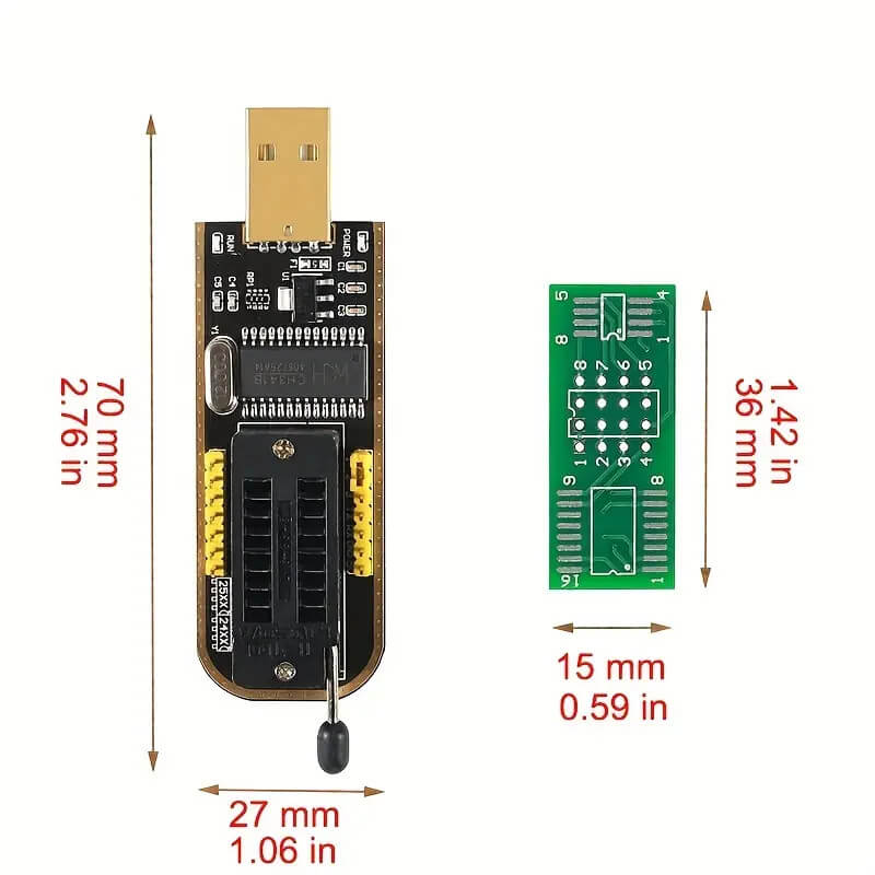 • Es compatible con chips de memoria 24 y 25 (como 24Cxx, 25xx y similares), que se utilizan comúnmente en BIOS, firmware de routers, o dispositivos con circuitos integrados de memoria.
