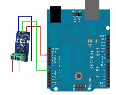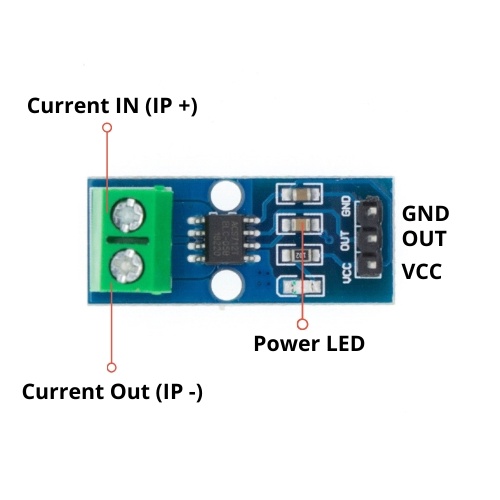 Este módulo basado en el circuito integrado ACS712 de Allegro MicroSystems permite medir la cantidad de corriente que fluye a través de un circuito de corriente alterna (AC) o corriente directa (DC). El método de sensado es a través de un sensor de efecto hall que provee un voltaje de salida proporcional a la corriente que fluye en el circuito. El trayecto para la medida de corriente es por el interior del circuito integrado y se encuentra aislado del circuito de procesamiento.