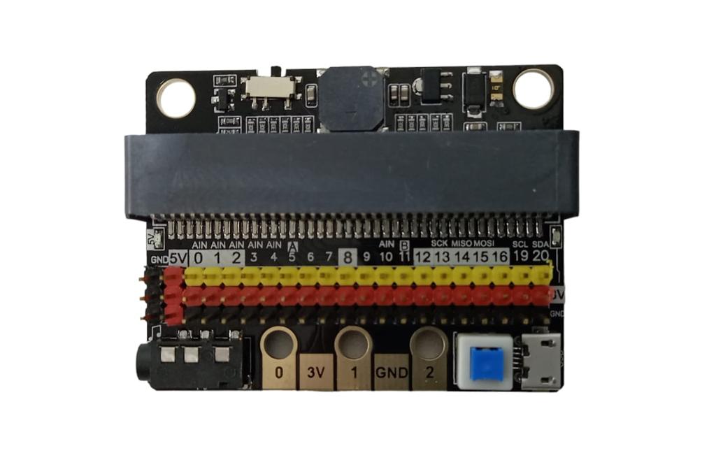 Esta es una tarjeta de expansión para la BBC micro:bit. Esta diseñada para el conector de peineta de la tarjeta y te permite acceder a todas las salidas de la micro:bit; incluye también un buzzer, un interruptor de enclavamiento para seleccionar la alimentación, un jack de 3.5mm y un conector micro USB. Todas las salidas son accesibles mediante conectores header macho.